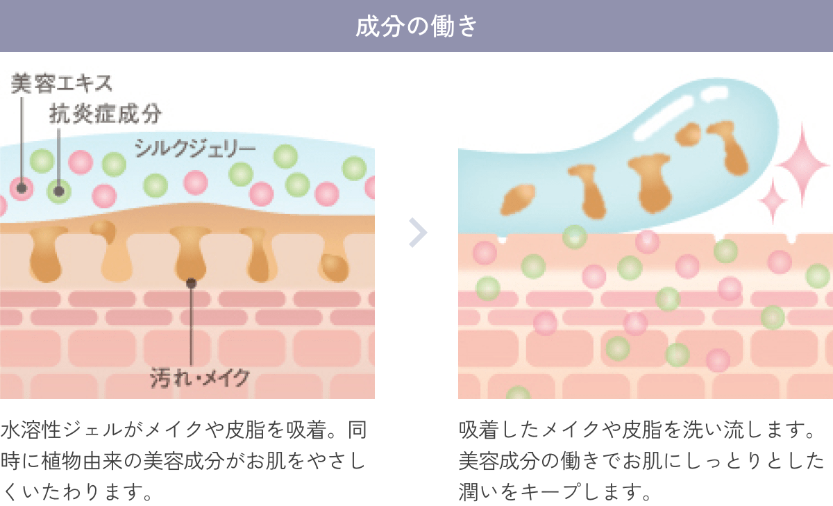水溶性でやわらかなジェルがメイクや皮脂に吸着し、洗い流すだけでスッキリ肌に。こすらずに汚れを落とせるので、肌に負担もかけません。「白金(プラチナ)」や「プロパンジオール」をはじめ、4種の植物エキスを配合。流し終えた直後から、贅沢な潤いを実感できます。