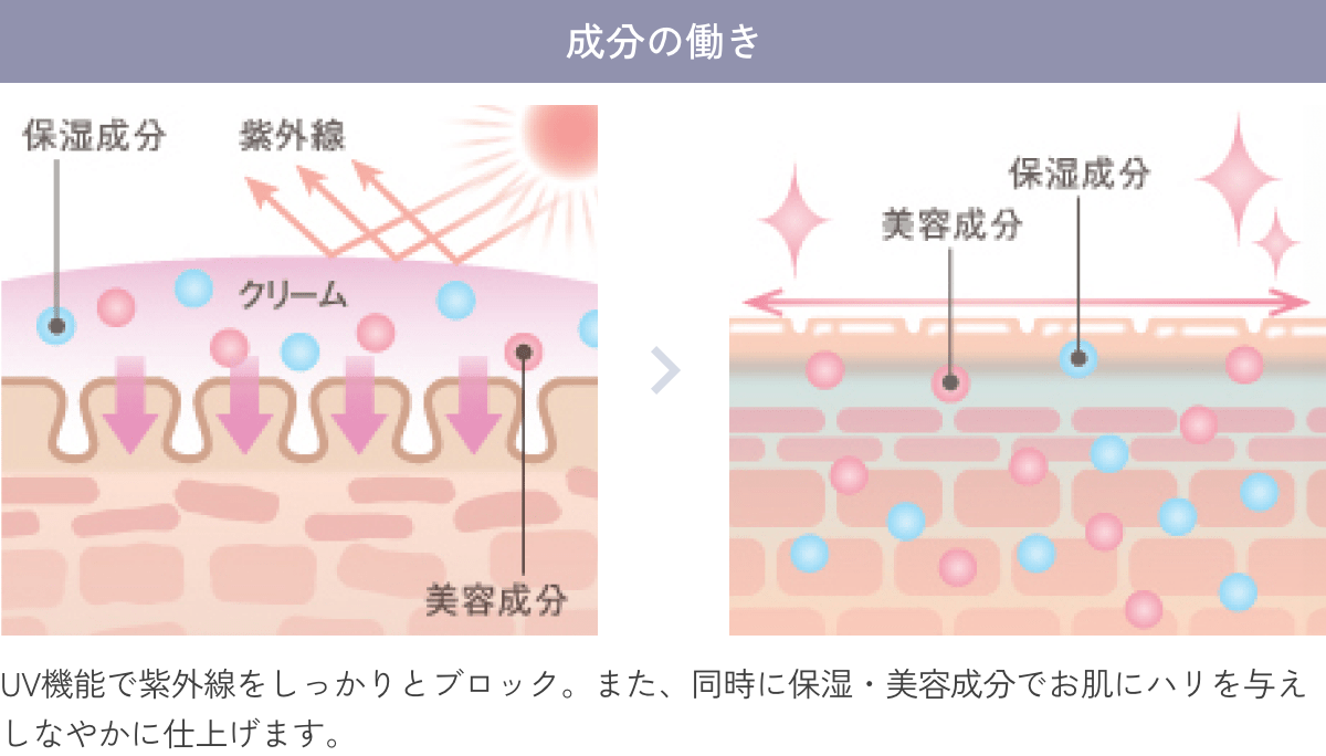UVケアと保湿を兼ね備えた画期的なUVケアクリーム。美容液・UV・化粧下地の3つの役割がこれ1本でばっちり。紫外線から肌を守りながら、「自然に輝く肌力」を演出します。また、ウォータープルーフでありながら、洗顔だけですっきりと落とせるので使い心地も抜群です。